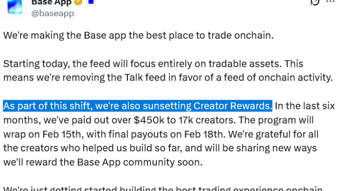 The sunset of Creator Rewards does not affect Base App’s Creator Coins program, which allows users to create ERC-20 tokens linked to their Base App profile and decentralized social media platform Zora.